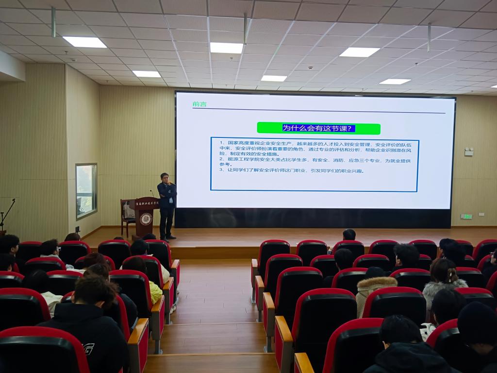 为帮助学生明晰安全评价师职业发展路径,提升职业素养,11月27日下午15:00,能源工程学院特邀产业教授吴令,在1号教学楼1307学术报告厅开展"如何成长为一个合格的安全评价师"专题讲座,能源工程学院相关专业学生到场聆听。
